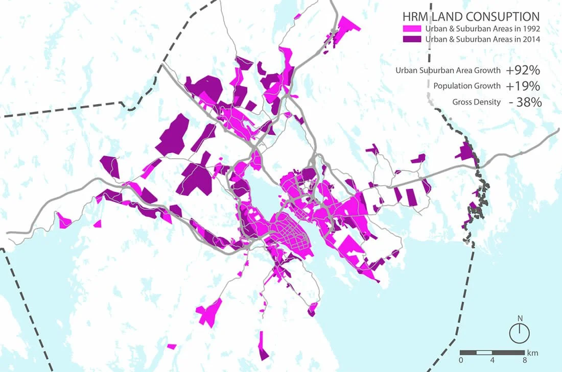 Between 1992 and 2014, Halifax nearly doubled in size, while our population only increased by 1/5th. This style of growth raises our tax burden, takes over wildlife habitat, and is unsustainable as we face an urgent need to mitigate and prepare for climate change.